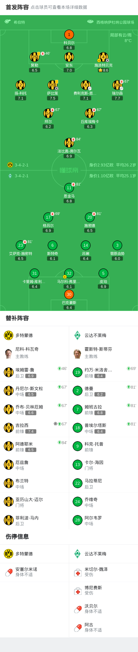 第67分钟,小红书丨多特连换三人,吉拉西、乔布-贝林厄姆、斯文松替补登场